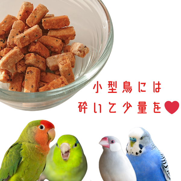 メーカーによりますと小型鳥さんにも砕いたり、水に浸すことで食べてもらえる全ての鳥向けおやつになっています。